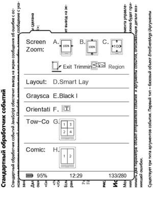 Просмотр PDF на 6″ экране Onyx по удобству можно сравнить с Kindle, но только с точки зрения размера экрана. Также приходится разворачивать изображение в ландшафтную ориентацию, чтобы текст был читабельным. Но иногда при просмотре возникают проблемы. Самый удобный режим чтения PDF в Onyx — режим «свитка», когда текст идет сплошной полосой, без разбиения на страницы, т. е. страницы как бы склеиваются. Применяя в тандеме с этим режимом опцию «По ширине», читать PDF наиболе комфортно. Но при длительном нажатии на кнопку Next (для пролистывания сразу на несколько страниц вперед) форматирование сбивается — текст начинает выходить за края экрана, и приходится заново заходить в настройки. В Kindle есть очень удобная возможность увеличения и уменьшения контраста изображения (действует как на картиночные, так и на текстовые PDF) — за счет увеличения контраста читать порой становится удобнее. В Onyx этой возможности не имеется.