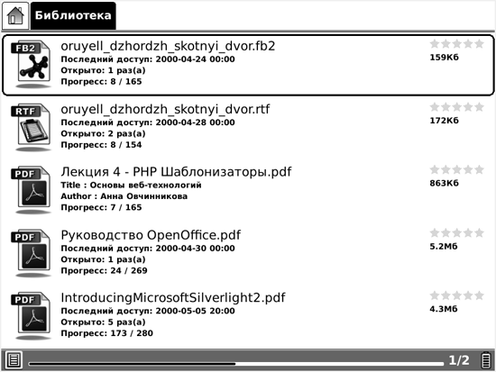 Также к плюсам можно отнести то, что «книжная полка» в устройстве сохраняет структуру папок, которую вы скопировали в память устройства или на карту памяти SD — никаких вручную создаваемых коллекций, всё просто.