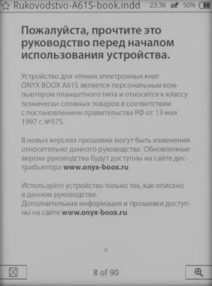 Удобство чтения формата PDF зависит от файла, который вы будете читать. Если у страниц файла не слишком широкие поля, то текст обычной книги будет достаточно крупным — и в портретной, и в альбомной ориентации. Если же в файле широкие отступы от края страницы, то много места будет съедено пустыми полями, и текст будет мелкий, придется переворачивать изображение в альбомную ориентацию и пользоваться прокруткой вниз, чтобы дочитать текст до конца. Режимов обрезки белых краев или же плавной настройки зуммирования в данной книге нет, поэтому нельзя однозначно сказать, будет ли удобно читать PDF. Софт в надстройке Duokan для Amazon Kindle, или же в книге Pocketbook 902 лучше заточен на чтение PDF.