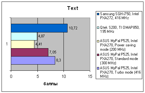 416-мегагерцевый процессор и неплохой уровень реализации подсистемы памяти позволяют ASUS MyPal P525 войти в группу самых производительных современных коммуникаторов. Как и следовало ожидать, производительность процессора в целочисленных операциях и действиях с плавающей запятой соответствует его частоте, а вот графические операции выполняются быстро — скорость обмена данными с оперативной памятью (а в Pocket PC графическая память является областью в оперативной) выше, чем у большинства современных коммуникаторов. Отставание в комплексном тесте Text от Samsung SGH-i750 объясняется использованием в продукте ASUS операционной системы Windows Mobile 5.0, а в Samsung — Windows Mobile 2003 SE; в первом случае пользовательские данные, обрабатываемые тестом извлекаются из достаточно медленной оперативной памяти, а во втором — сначала копируются в быструю оперативную и используются уже оттуда. Однако разница в результатах весьма невелика, и это позволяет говорить о том, что P525 достаточно быстр, несмотря на особенности программной архитектуры.
