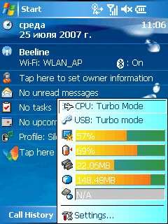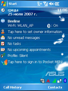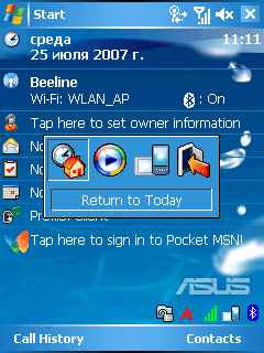 Значки наиболее полезных утилит расположены в правом нижнем углу Today. Их наличие — отличительная часть всех карманных компьютеров Asus. Прежде всего, это утилита Asus Status. В одном небольшом окне выводится вся важная информация о текущих параметрах работы процессора, яркости дисплея, объема доступной памяти и заряде аккумулятора. При клике по любому из них, запускается соответствующая утилита или окно настройки. Два других значка информируют о работе интерфейсов Bluetooth или Wi-Fi. С помощью четвертой иконки можно изменить ориентацию экрана.