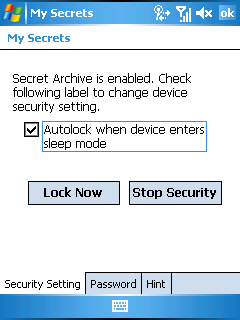 Интересная программа для любителей секретов и тайн называется вполне доступно — My Secrets. Пройдя несколько шагов мастера можно создать секретный каталог внутри папки Мои документы. Вся информация внутри него шифруется. Кроме того, на экране Today появляется значок в виде папки с замком. Доступ к секретному каталогу можно получить, если ввести пароль.