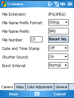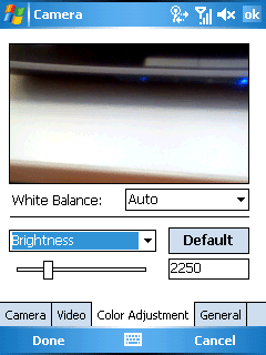 Управление фотокамерой осуществляется в специализированном приложении. Запустить съемку можно только с помощью аппаратной клавиши на левом торце коммуникатора. Информация из приложения не выводится в видеобуфер операционной системы, поэтому получить изображение экрана интерфейса фотокамеры не удалось. На этом экране находятся индикаторы режимов работы камеры, вспышки, разрешения и качества снимков, а также количество оставшихся кадров.