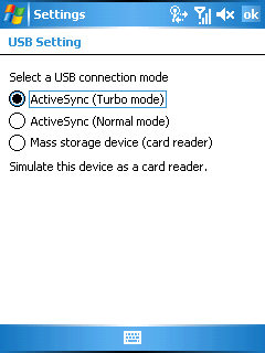 Одной из полезных функций карманных компьютеров Asus является режим эмуляции кард-ридера при подключении к порту USB. Выбрать, как себя будет вести коммуникатор при подключении к настольному компьютеру, можно в апплете USB Setting.