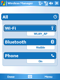Разработчики коммуникатора разместили основные индикаторы работы устройства на экране Today. В верхней части находятся значки состояния беспроводных интерфейсов и телефона. При нажатии на любой из них запускается приложение Wireless Manager — системный центр управления всеми беспроводными интерфейсами.