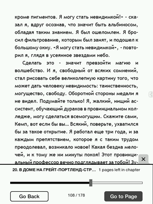 Удобно организовано перемещение по файлу с книгой — в виде прогресс-бара, как в музыкальных плеерах. Вы просто тянете за ползунок и перемещаетесь по книге, при этом внизу бегут цифры, обозначающие номера страниц.
