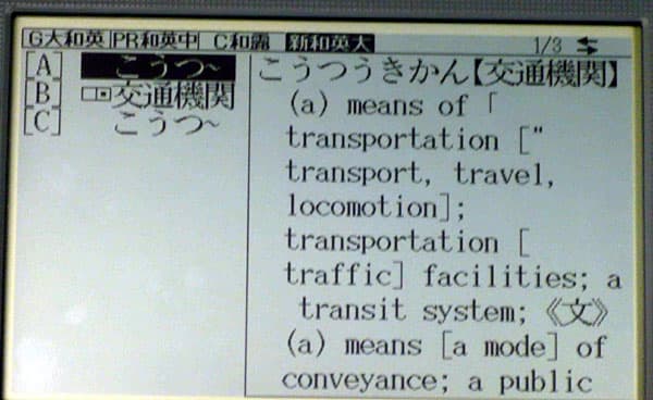 Для иллюстрации охарактеризованной ситуации, приведем два примера. При фонетическом вводе SANN (две буквы N) японско-русский словарь не дает значения гора. Словарь Shogakukan Progressive Japanese-English Dictionary, встроенный в устройство, показывает его (mount). Другой пример — слово машина (работа с ним продемонстрирована выше). Обратный перевод с японского на английский (первого варианта второй категории, включающего четыре иероглифа см. Рис 10), а не на русский, даст значение means of transportation для четырех иероглифов (Kenkyusha's New Japanese-English Dictionary, см. Рис. 20). Следующая итерация с привлечением англо-русского словаря приведет к фразе средства сообщения.
