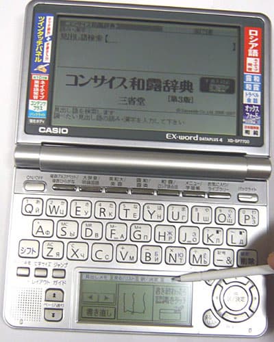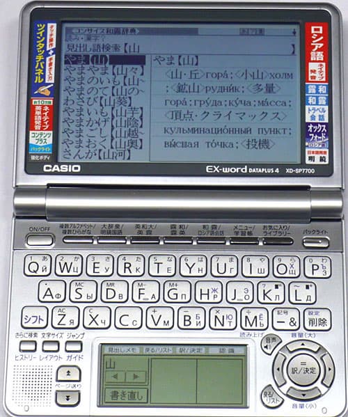Главная особенность устройств XD-SP7700 и XD-SF7700 — в наличии функции рукописного ввода иероглифов, а также символов кириллицы и английских символов. Прежде всего, это может быть интересно для наших соотечественников, проживающих в Японии или посещающих ее с частыми визитами. Эти устройства могут быть действительными помощниками в повседневной жизни: магазины, рестораны, передвижение по стране, медицинский сервис. Здесь иностранец один на один с людьми, говорящими, как правило, только на родном японском... Теперь стало реальностью срисовывать иероглифы с витрин магазинов, меню ресторанов, рецептов врача и т.д. Словарь даст перевод на русский язык, произнесет слово на японском (заметим, не всякое) и покажет, как произносить слово (фразу) через запись символами хираганы.