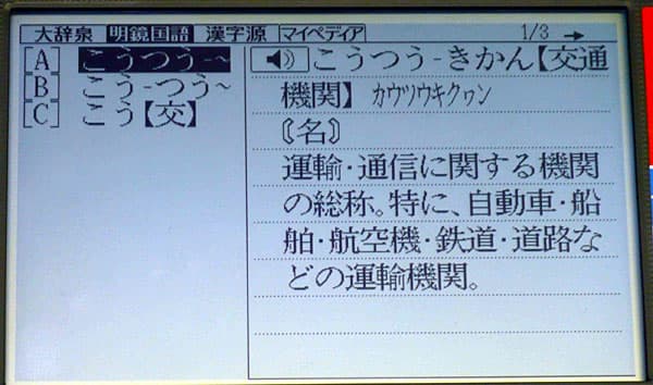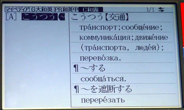 Внимательные читатели заметят, что над фразой средства сообщения есть слово из наших четырех иероглифов. Если вернуться назад еще раз (клавиша 13), выделить первый иероглиф и перейти на произношение слова, то словарь озвучит всю фразу, из четырех иероглифов! См рис.13 ниже. Словарная база словаря Meikyo Japanese Language Dictionary больше словарной базы японско-русского собрата.