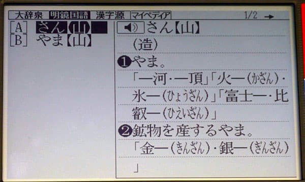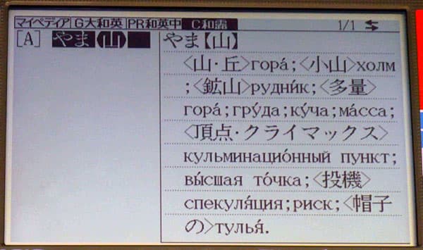 - e. Словарь произносит слово после касания клавиши 12 или только в XD-SF7700: клавиша 28 (для нашего слова есть две транскрипции и, соответственно, два произношения: «сан» и «я-ма»).