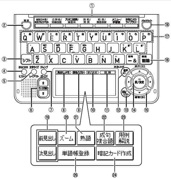 Русское руководство, подготовленное специалистами CASIO, не описывает назначения всех клавиш (см. http://support.casio.jp/manualfile.php?cid=003015019). Для удобства повествования мы используем рисунок клавиатуры из английского руководства (http://support.casio.jp/manualfile.php?cid=003015005). Как по набору клавиш, так и по их назначению, клавиатуры обоих моделей идентичны. Клавиатура переключается автоматически на требуемый язык после выбора пользователем словаря.