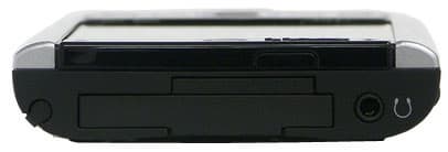 На левой грани размещены: двухпозиционный переключатель блокировки ввода и две дополнительные кнопки. Последние по умолчанию отвечают за включение Wi-FI и вызов диктофона. Первый в положении «заблокировано» заставляет КПК игнорировать любые нажатия на кнопки быстрого запуска, джойстика или щелчки по сенсорному экрану. Полезность этого элемента управления проще всего оценить, пользуясь комплектным чехлом, конструкция которого такова, что при вынимании устройства палец обязательно задевает за кнопку включения беспроводной сети. В качестве модного дополнения на левом торце имеется крепление «шнурка» для ношения КПК на запястье (или шее, если двести грамм веса и солидные размеры не будут смущать владельца и окружающих).