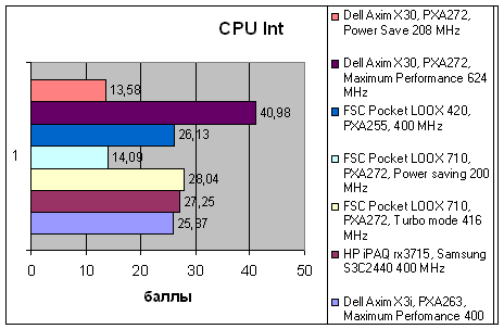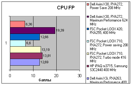 Комментировать результаты в этот раз достаточно просто. Это однозначный лидер по производительности среди современных КПК с экраном QVGA, а если учесть, что показатели VGA-устройств еще ниже, то лидерство X30 распространяется на всю платформу Pocket PC. Причина очевидна – это применение 624-мегарерцевого CPU в сочетании с небольшим экранным разрешением. Графики производительности процессора показывают заметное превосходство X30 над всеми остальными моделями. Разница тем более очевидна, что все конкуренты оснащены чипами 400 MHz.