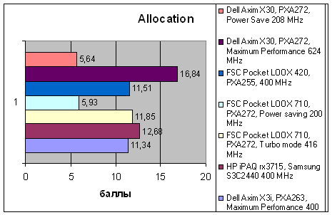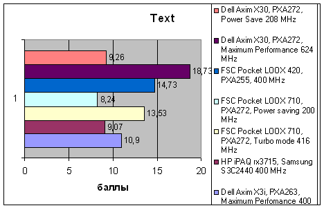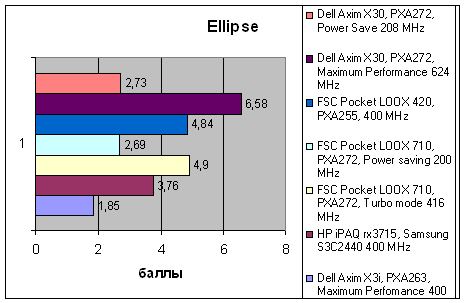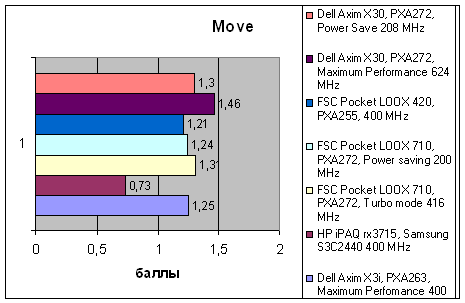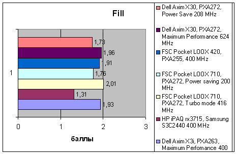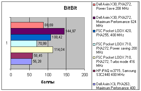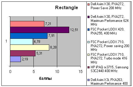 Высокие достижения процессора поддержаны хорошими показателями остальной системной электроники, и это позволяет X30 оставаться в лидерах во всех остальных тестах. В первую очередь это видно по показателям тестов подсистемы памяти: время поиска лучше, чем у остальных моделей среднего класса, пропорционально производительности CPU, а скорость передачи данных находится примерно на одном уровне. Это вполне закономерно, так как в Pocket PC среднего класса обычно используется качественная память. Сочетание этого показателя и отличных скоростных данных CPU позволяет получать выдающиеся результаты при работе с графикой и обеспечивает лучший на сегодня интегральный показатель быстродействия.