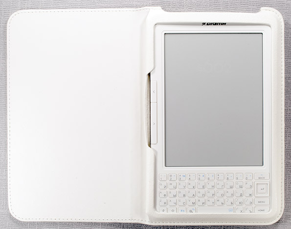 Идущая в комплекте обложка выглядит достаточно дешево и неказисто. Собственно, чего греха таить: не только выглядит, но и является таковой на самом деле — совершенно очевидно, что основным побудительным мотивом производителя было «оптичить» пункт в списке комплектации. Спасает ее то, что она белая — белый цвет вообще выглядит наряднее прочих, пока не загрязнился. Кстати, о загрязнениях: еще один плюс обложки состоит в том, что они довольно легко стираются обычной влажной тряпочкой (все мы иногда грешим чтением за кухонным столом, и последствия вполне предсказуемы).