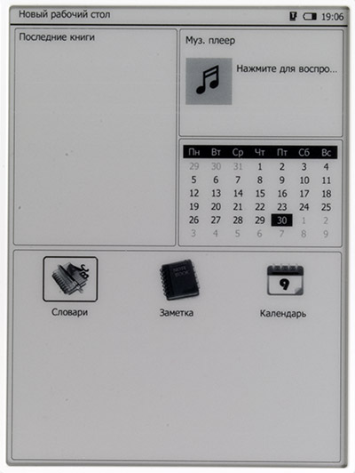 Главный экран достаточно стандартен для устройств подобного типа и содержит все необходимое: основное меню, календарь, апплет музыкального плеера, список недавно прочитанных книг (отображены только 2 последние книги, но если нажать на кнопку «Еще» — появится полный список).