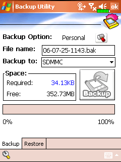 В папке Utilities находятся несколько фирменных утилит для работы с коммуникатором и программы управления беспроводными интерфейсами. Backup Utility, как ясно из названия, создает резервные копии наиболее ценных для пользователя и функционирования системы данных. Архивы можно располагать как во встроенной флэш памяти, так и на SD картах. Насколько полезна данная утилита, пусть каждый решает сам, в WM5.0 все данные уже хранятся в энергонезависимой памяти и без злого умысла стереть их сложно. При достижении критического уровня заряда аккумулятора архивация некоторых файлов запускается автоматически. Восстановить данные из архива так же просто, как и записать их туда, после восстановления необходимо перезагрузить компьютер. Утилита Default settings сбрасывает все настройки произведенные пользователем и удаляет установленные им программы. Этакий программный hard reset.