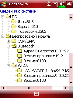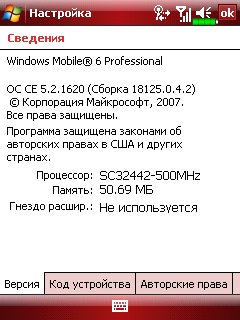 - Операционная система Windows Mobile Professional 6 (5.2.1620 сборка 18125.0.4.2), версия прошивки A42 RUS 010 0302;
