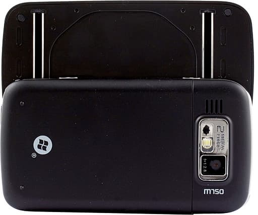 Большую площадь задней панели корпуса М750 занимает аккумуляторный отсек. В верхней части панели находятся основной динамик коммуникатора и фотокамера со светодиодной вспышкой.