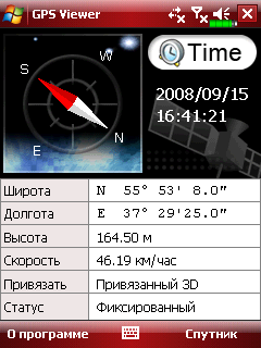 Работа с системой спутниковой навигации осуществляется с помощью чипа SiRF Star III, используемого в большинстве современных навигаторов и GPS коммуникаторов. Для его работы не требуется внешняя антенна. Чип способен обрабатывать сигнал одновременно с 12 спутников. Подробней о чипе можно узнать из статьи о Asus MyPal A636. Базовую информацию с модуля — расположение спутников, координаты, точное время, высоту над уровнем моря и скорость — показывает утилита GPS Viewer. Опорную информацию о спутниках с помощью программы Satellite Data Update можно загрузить из сети.