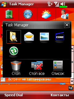 Все там же, на экране Today, в нижнем правом углу находится значок утилиты Task Manager. Как можно догадаться из названия, основная задача апплета — управлять запущенными приложениями. Это программный аналог известной комбинации Alt+Tab с возможностью завершения работы процессов.