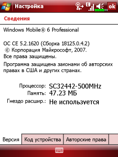 - Операционная система Windows Mobile 6.0 Professional (CE 5.2.1620 сборка 18125.0.4.2), версия ПО коммуникатора A42 RUS 030 0257