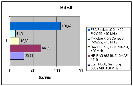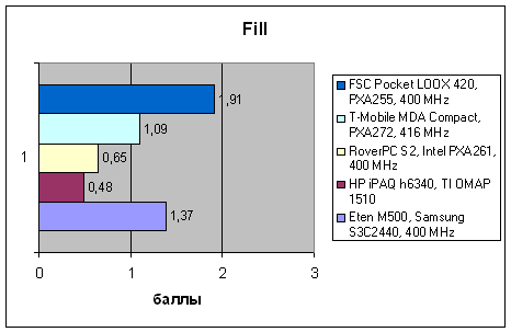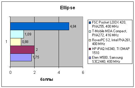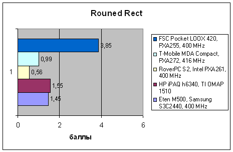| VOBenchmark | E-Ten M500, Samsung S3C2440, 400 MHz | HP iPAQ h6340, TI OMAP 1510 | RoverPC S2, Intel PXA261, 400 MHz | T-Mobile MDA Compact, PXA272, 416 MHz | FSC Pocket LOOX 420, PXA255, 400 MHz |