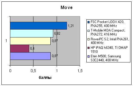 E-Ten M500 ощутимо быстрее большинства современных коммуникаторов на Pocket PC, в частности – популярного HTC Magician. Главное его преимущество – быстрый CPU. Усовершенствованный ARM-процессор Samsung заметно опережает по быстродействию основного конкурента – 416-мегагерцевый чип Intel PXA272, причем отрыв в операциях с плавающей запятой больше, чем в целочисленных. Но одним процессором в КПК сыт не будешь, так что свой вклад в успех модели вносит качественная подсистема памяти. Нельзя сказать, что она сверхбыстрая, производительность ее скорее «на уровне» конкурирующих разработок (того же Magician и «2,8-дюймового» раскладного коммуникатора Wistron/Lenovo, известного у нас под обозначением RoverPC S2), она не «вытягивает», но и не обременяет процессор, позволяя ему хорошо делать свою работу.