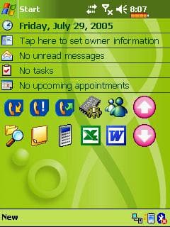 Главный экран обычен для Windows Mobile 2003 SE Phone Edition. Это минимально видоизмененный экран Today, традиционный для Pocket PC, отличающийся наличием индикатора заряда батареи и силы сигнала GSM-сети. Отличительной особенностью M500 является панель с пиктограммами для вызова избранных приложений и утилит.
