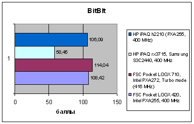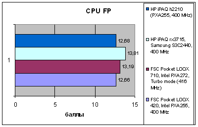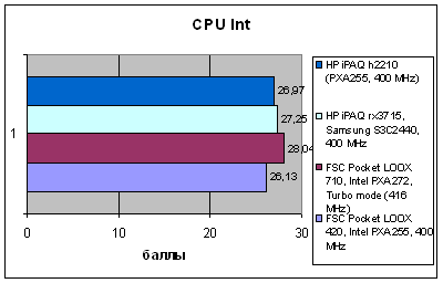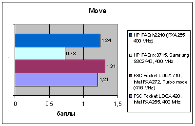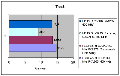 А вот что действительно интересно – так это близость результатов моделей Pocket LOOX 420 и 710, что удивительно, так как у этих решений совсем разное происхождение. И тем не менее, они идут практически вровень, небольшое преимущество Pocket LOOX 710 может объясняться незначительной разницей в частоте и производительности процессора. На самом деле такое равенство – это комплимент старшей модели, так как показатели платформы HTC на протяжении уходящего года считались эталонными для КПК верхнесреднего класса. Инженеры, работавшие над моделью 710, сумели повторить это достижение. Также это свидетельствует о том, что в старшей модели использованы качественные комплектующие, а в младшей – установлено все то, чем мог похвастаться iPAQ h4150. Никакого упрощения платформы или использования более доступных аналогов элементной базы не произошло, и это есть хорошо.