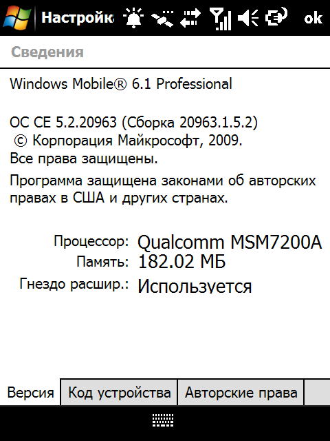 - Операционная система Windows Mobile 6.1 Professional (Сборка 20963.1.5.2), бесплатное обновление до версии Windows Mobile 6.5;