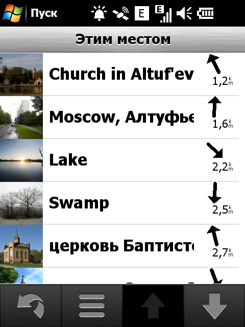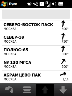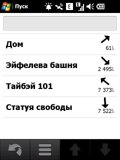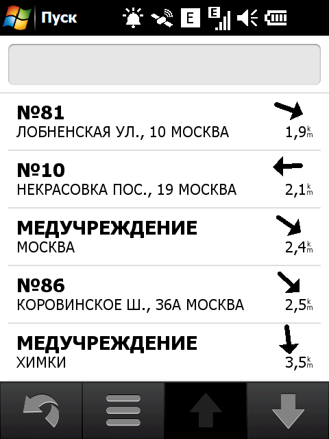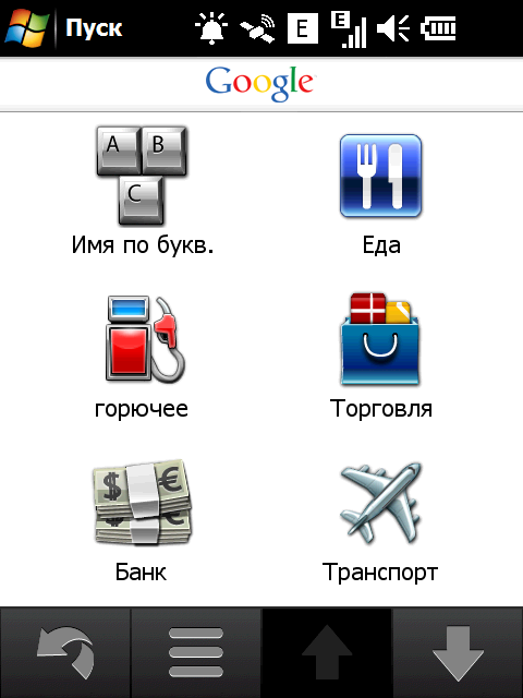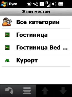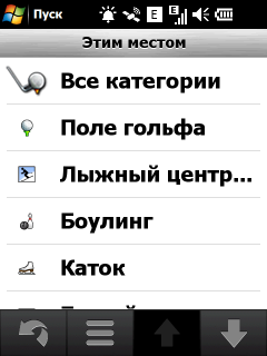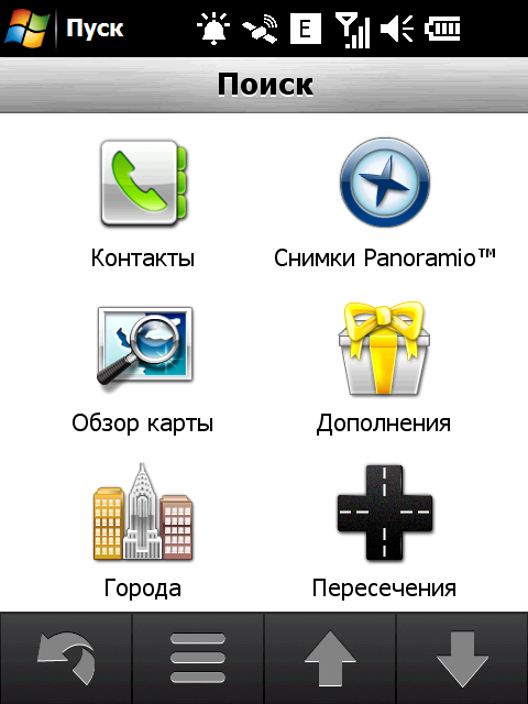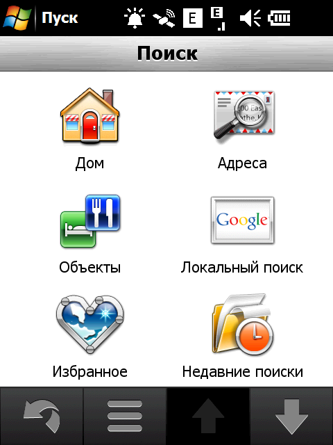 Нажатие на значок «Поиск» активирует поиск различных объектов на навигационной карте. Вариантов поиска хватает: по адресу, типу объекта на карте, типу объекта с помощью Google, списку избранных объектов, списку недавних поисковых запросов, поиск локаций с фотографиями из сетевого каталога Panoramio, списку ближайших городов, поиск перекрестка заданных улиц, ввод цифровых координат места и, наконец, просто возврат к заданной домашней локации.