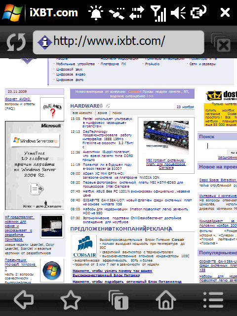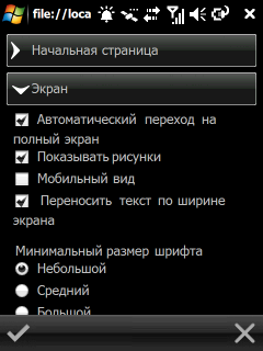 О программах, связанных со спутниковой навигацией, речь пойдет в отдельном пункте, а пока же рассмотрим остальные приложения и элементы оболочки. Стоит отметить, что в качестве браузера по умолчанию используется Opera Mobile, хорошо известная и удобная программа для платформы Windows Mobile. Созданная с учетом управления и навигации пальцем, она обеспечивает автоматическое масштабирование открытых страниц, выравнивание текста по ширине экрана, открытие страниц на нескольких вкладках, поддержку технологий Flash и JavaScript, имеет крупные пункты меню, которые автоматически сворачиваются, освобождая основное окно программы. Портит общее впечатление небольшой размер экрана, но эту претензию следует адресовать разработчикам устройства, а не браузера.