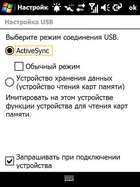 Определение настроек сотовой сети происходит автоматически. От пользователя не требуется что-либо делать для конфигурации GPRS-подключения или службы MMS. Коммуникатор может имитировать флэш-накопитель при подключении к USB порту компьютера — удобная возможность, если нужно скопировать данные, а ActiveSync отсутствует или его нельзя установить. Если вспомнить, что у Nuvifone M20 нет слота сменных карт памяти, режим mass storage сложно недооценить!