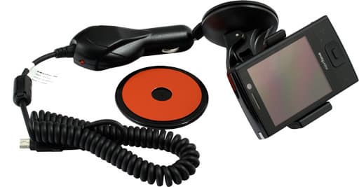 К слову о «наборе автомобилиста»: присоска со сферическим шарниром, диск для ее крепления на неподходящие поверхности (с нанесенным клеем), держатель с отверстием для подключения сетевого адаптера, собственно, сам адаптер для 12 вольтовой бортовой сети автомобиля. Набор исчерпывающий.