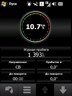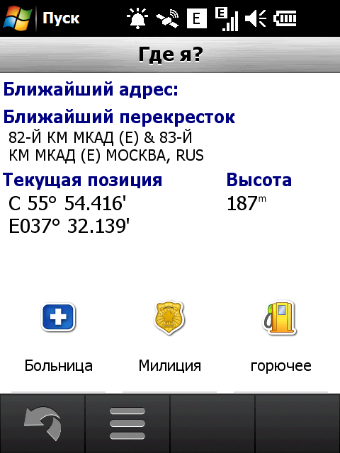 Две иконки приложений спутниковой навигации расположены в нижней части главного экрана коммуникатора. Пункт «Обзор карты», как и следует, открывает окно с картографической информацией и положением коммуникатора. Там же можно увидеть информацию о спутниках, скорости и координатах. Статистическую информацию можно просмотреть в журнале поездки, открывающимся нажатием на кнопку «Скорость». Соседняя кнопка «Курс» переносит на экран с интригующим заголовком «Где я?», который содержит данные о местоположении коммуникатора, ближайший адрес, перекресток, точные координаты. Здесь же пользователь может выйти на адреса экстренных служб и найти, где пополнить бак автомобиля. В общем, страница-помощник для паникующего владельца.