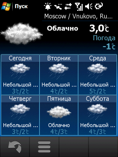 Прогноз погоды на несколько дней можно узнать с помощью программы Погода, чей основной недостаток заключается в желании обновлять данные с сервера в Интернете каждый раз при открытии окна. Часть настроек коммуникатора вынесена в отдельное окно, где можно изменить набор и расположение иконок быстрого запуска, открыть менеджер беспроводных соединений, сменить тему и обои, установить различные мелодии звонка, изменить многочисленные настройки программы навигации, получить дополнительную информацию об оболочке.
