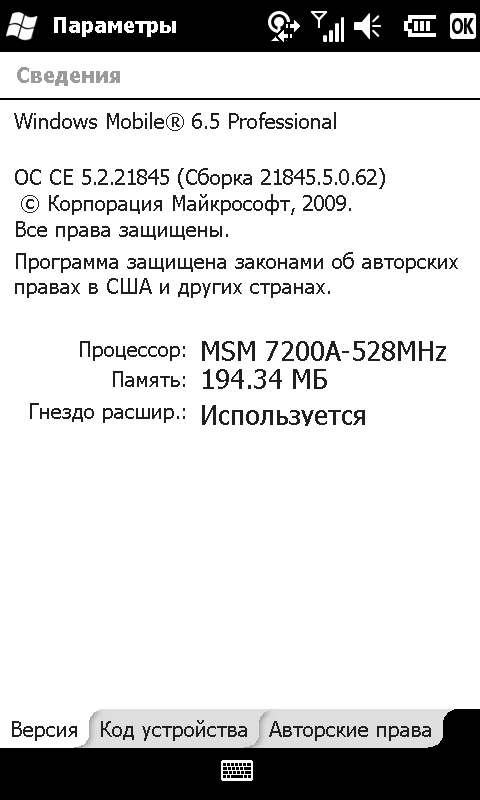 - Операционная система Windows Mobile 6.5 Professional (Сборка 21845.5.0.62);