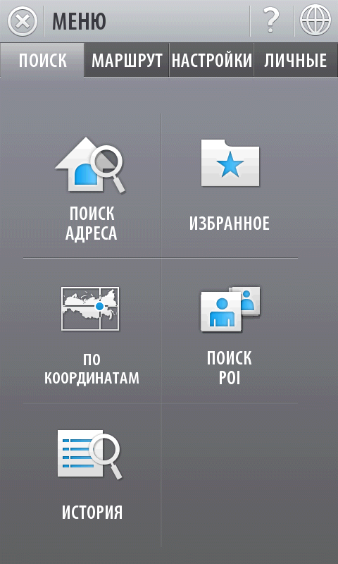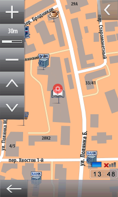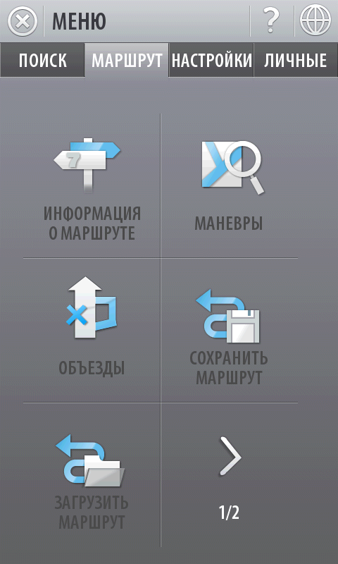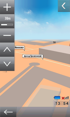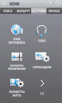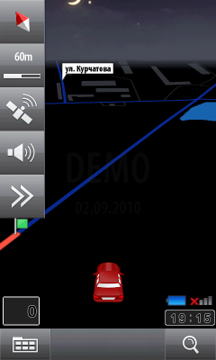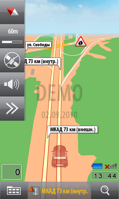 Внешний вид программы лаконичен. Интерфейс и меню несколько запутанны, приходится привыкать. Впрочем, ровно то же можно сказать про большинство программ навигации: стандартов на оформление таких приложений не существует, а разработчики стараются «кто во что горазд». У карты только один вид, изменяемый по масштабу и по наклону вручную. При проезде особо сложных участков дорог (например, развязок), в верхней части экрана появляется отдельное окно с подсказкой направления движения. Тут придется в очередной раз сделать оговорку о небольшом размере экрана коммуникатора. Это ведет к трудностям общения с программой — в мелкие элементы приходится всматриваться, что в движении не способствует концентрации на вождении. Да и крепить коммуникатор приходится в буквальном смысле у самого носа водителя.