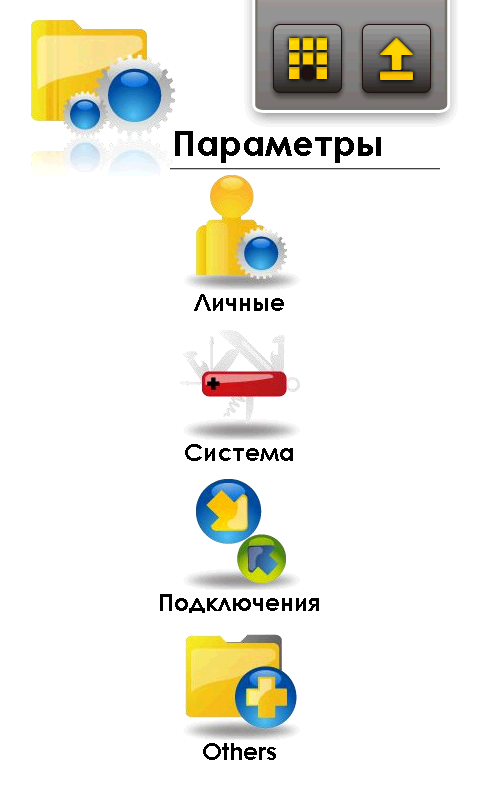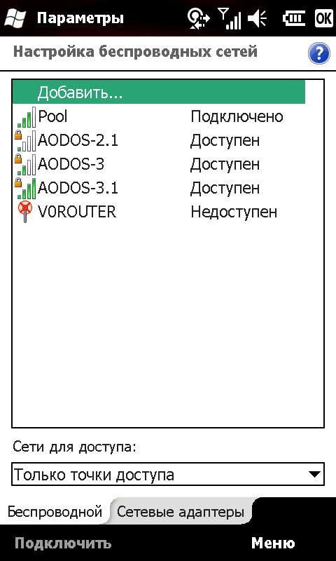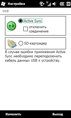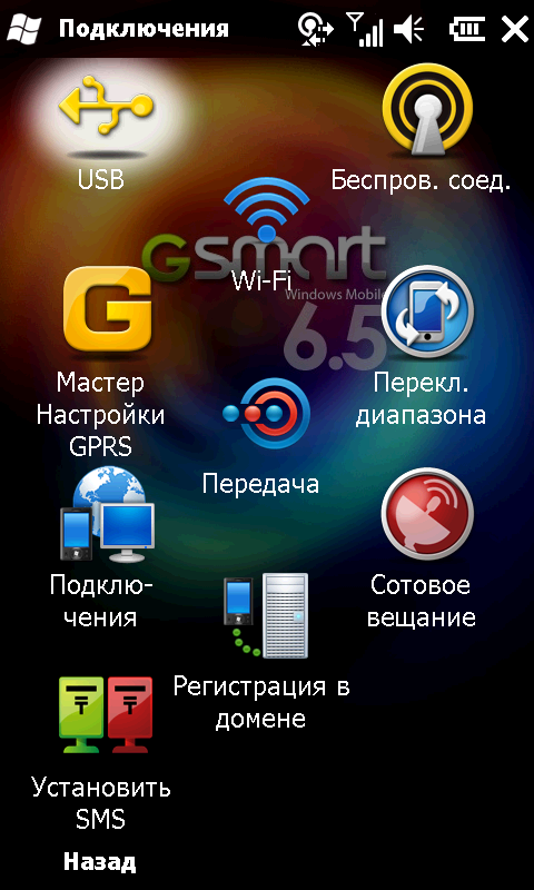 Иконки соответствующих программ и настроек собраны в каталоге Подключения. Там находятся: Менеджер беспроводных соединений, настройка беспроводных сетей Wi-Fi, Мастер настройки GPRS, настройка режима работы USB порта (либо стандартный ActiveSync, либо картридер SD карты), переключение рабочего диапазона модуля связи 2G/3G, настройка приема сообщений сотовой сети, регистрация в домене и выбор способа отправки SMS сообщений.
