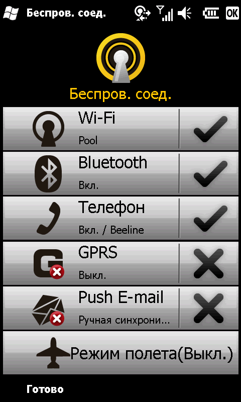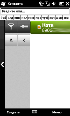 Вообще говоря, большинство настроек и стандартных программ сохранили свои интерфейсы, унаследованные из эпохи, когда операционная система устанавливалась на КПК и носила гордое имя Windows Mobile 2003. Конечно, расширение функционала операционной системы коснулось и их наполнения, и возможности управления пальцем. Но мелкие поля ввода так и не сделались крупнее, равно как не увеличились галочки и радио-кнопки. Из некоторых программ вышел занимательный гибрид. Так, «Контакты» сохранили старые ярлыки с несколькими буквами для быстрого перемещения по списку и поле ввода нужного имени. Но вдогонку получили удобные и большие кнопки-ускорители на левой выдвижной панели.