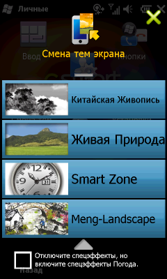 В S1200 кардинальная смена внешнего вида системной оболочки осуществляется двумя нажатиями. Избавиться от мелких стандартных индикаторов состояния телефона в верхней части экрана, микроскопической кнопки «Пуск», длинного списка всех программ и настроек очень просто. На выбор пользователю предлагается, помимо стандартной, шесть различных тем оформления. Субъективный выбор автора обзора —«Живая природа» как самая красивая и забавная, и «Smart Zone» как самая удобная.