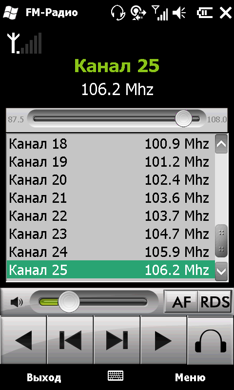 Гарнитура играет роль антенны встроенного FM радиоприемника. Отрадно, что этот простой модуль встречается в WinMobile коммуникаторах все чаще. Программа управления радиоприемником автоматически находит доступные радиостанции по мощности сигнала и заносит их частоту в список. Приемник поддерживает RDS. Интерфейс программы логичен, все основные функции вынесены на экран и представлены в виде крупных кнопок. Качество приема сигнала среднее, соответствующее другим коммуникаторам.