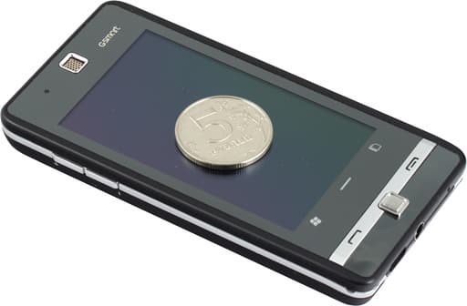 Как и положено, лицевая панель коммуникатора закрыта пленкой, отлично собирающей отпечатки пальцев и служащей зеркалом при сильном внешнем освещении. Под её защитой находятся дисплей и две сенсорные клавиши, расположенные чуть ниже. Одна из них выполняет архиполезную функцию быстрого открытия меню «Пуск» операционной системы, вторая используется для настройки модулей сотовой связи.