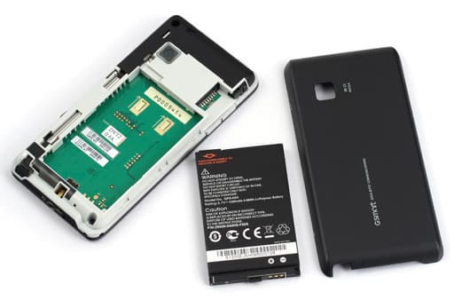 Несмотря на то, что крышка значительно заходит на боковые грани, она легко снимается и устанавливается на место одним движением пальца. Под ней находятся аккумулятор и слоты для SIM-карт. Карты устанавливаются параллельно друг над другом. Чтобы их поместить в слоты или извлечь, необходимо сдвинуть защелку. Основная SIM-карта располагается сверху. Автор долго разбирался, почему коммуникатор отказывается работать от аккумулятора, но отлично функционирует при подключении к USB-порту — оказалось, надо не забывать закрывать упомянутую защелку.