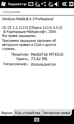 - Операционная система Windows Mobile 6.5 Professional (Сборка 21215.5.0.0);