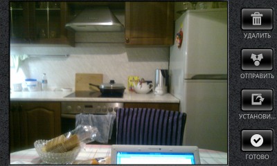 Интерфейс камеры оптимизирован для ландшафтного отображения. В правой части находится небольшое окошко редактирования фотографии (удалить, отправить как вложение, установить на обои, присвоить контакту или просто сохранить). Ниже находится переключатель режима фото/видео. В самом низу располагается кнопка съемки.