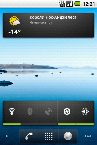 Виджетов на основном экране системы и вкладках немного: поиск Google, помощник по системе, новости и погода, аудиоплеер, Android Market.