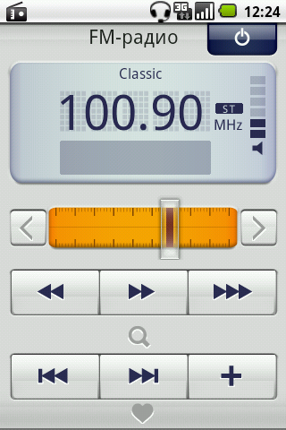 Программа управления радиоприемником обладает простым и понятным интерфейсом. Поиск станций осуществляется в автоматическом и ручном режимах. Понравившаяся станция может быть сохранена в ячейку памяти. Радиоприемник воспринимает информацию RDS, а в настройках программы его можно настроить на различные режимы частот, в зависимости от страны нахождения. Также стоит отметить, что громкость звука регулируется стандартными средствами коммуникатора, в том числе аппаратными клавишами, но только почему-то при включенном экране.