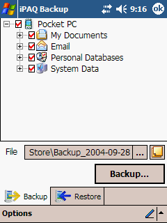 iPAQ Backup – программа для архивирования важной информации. В качестве носителя архивной копии используется карта SD или MMC, сохранять можно содержимое папки My Documents, почтовую базу, адресную книгу и системные данные.